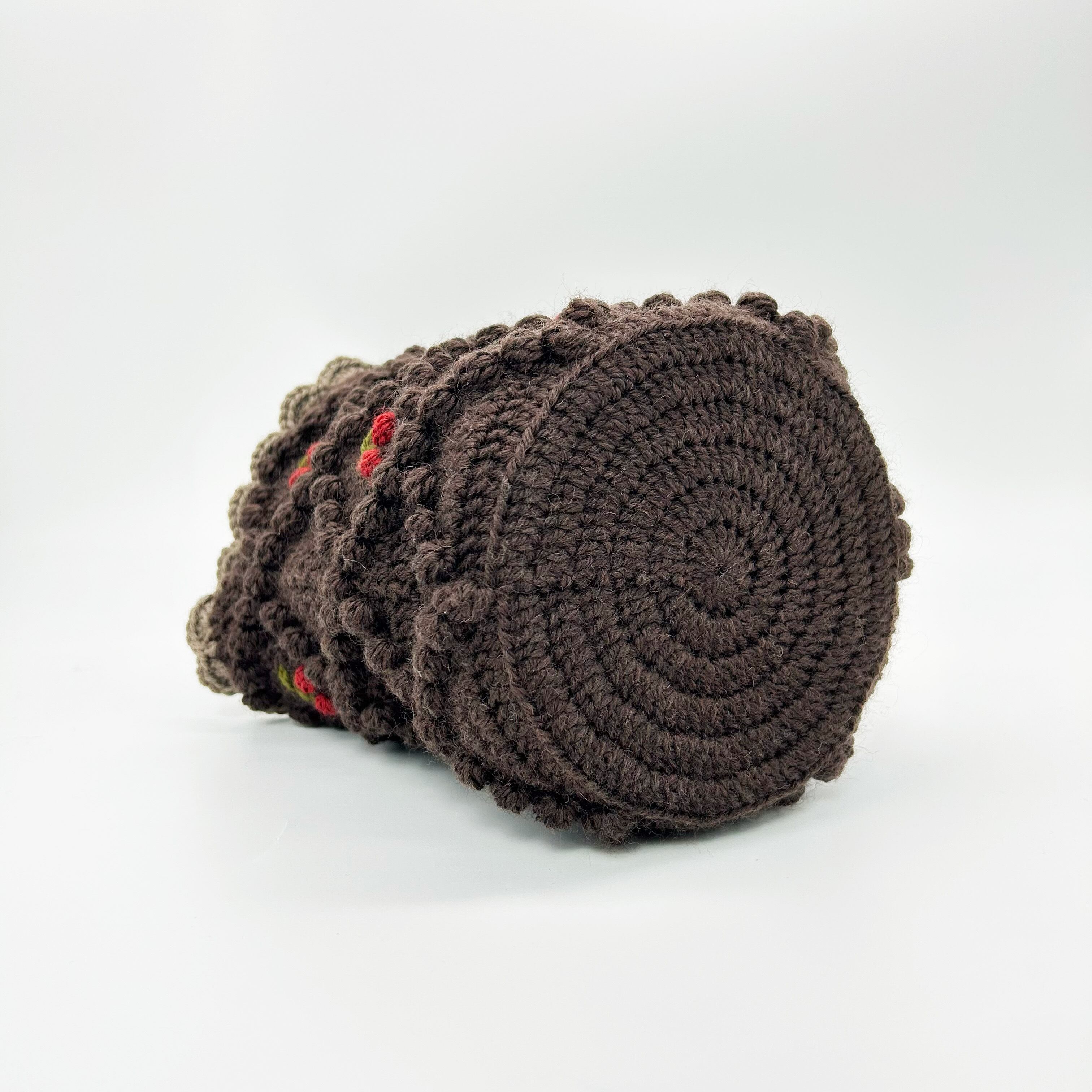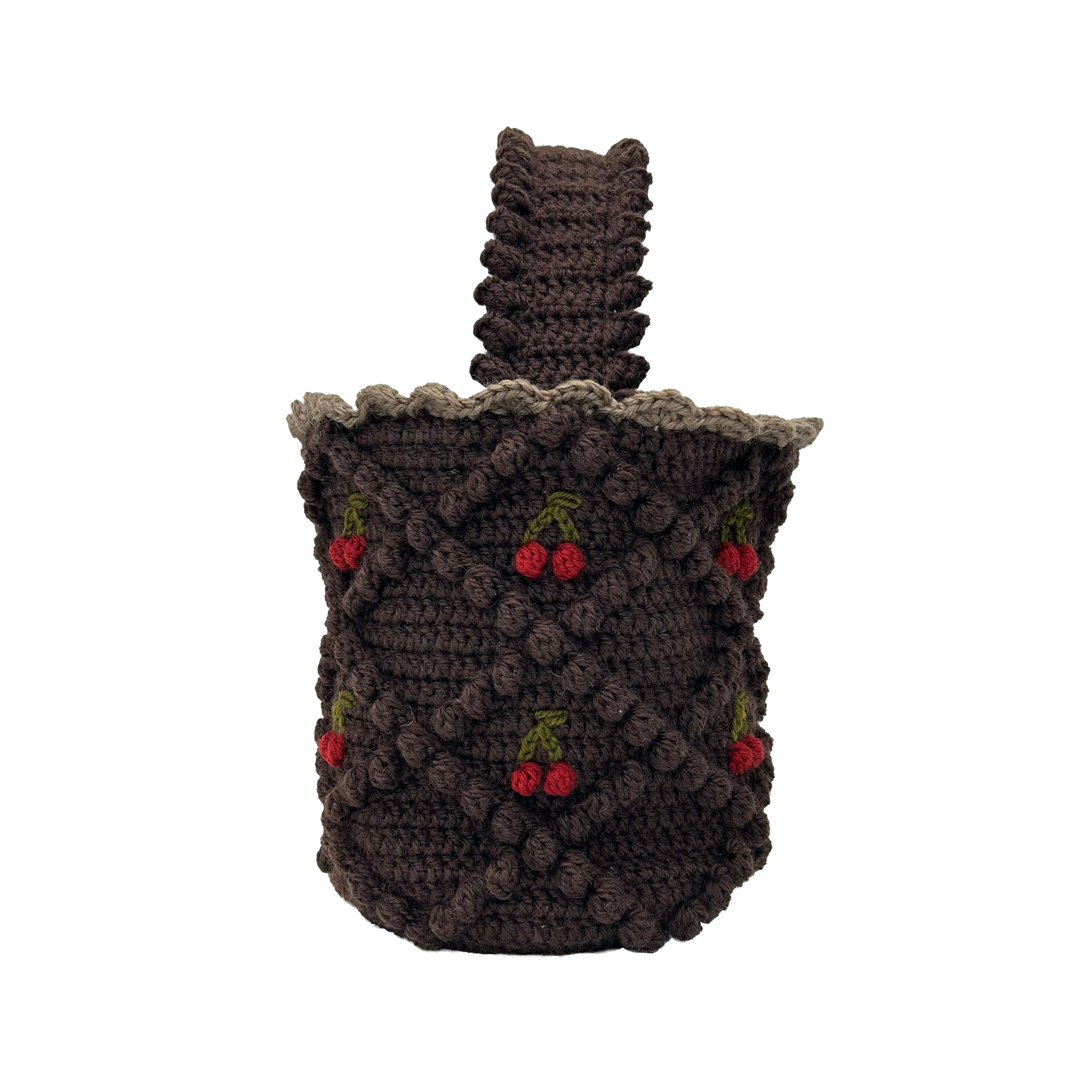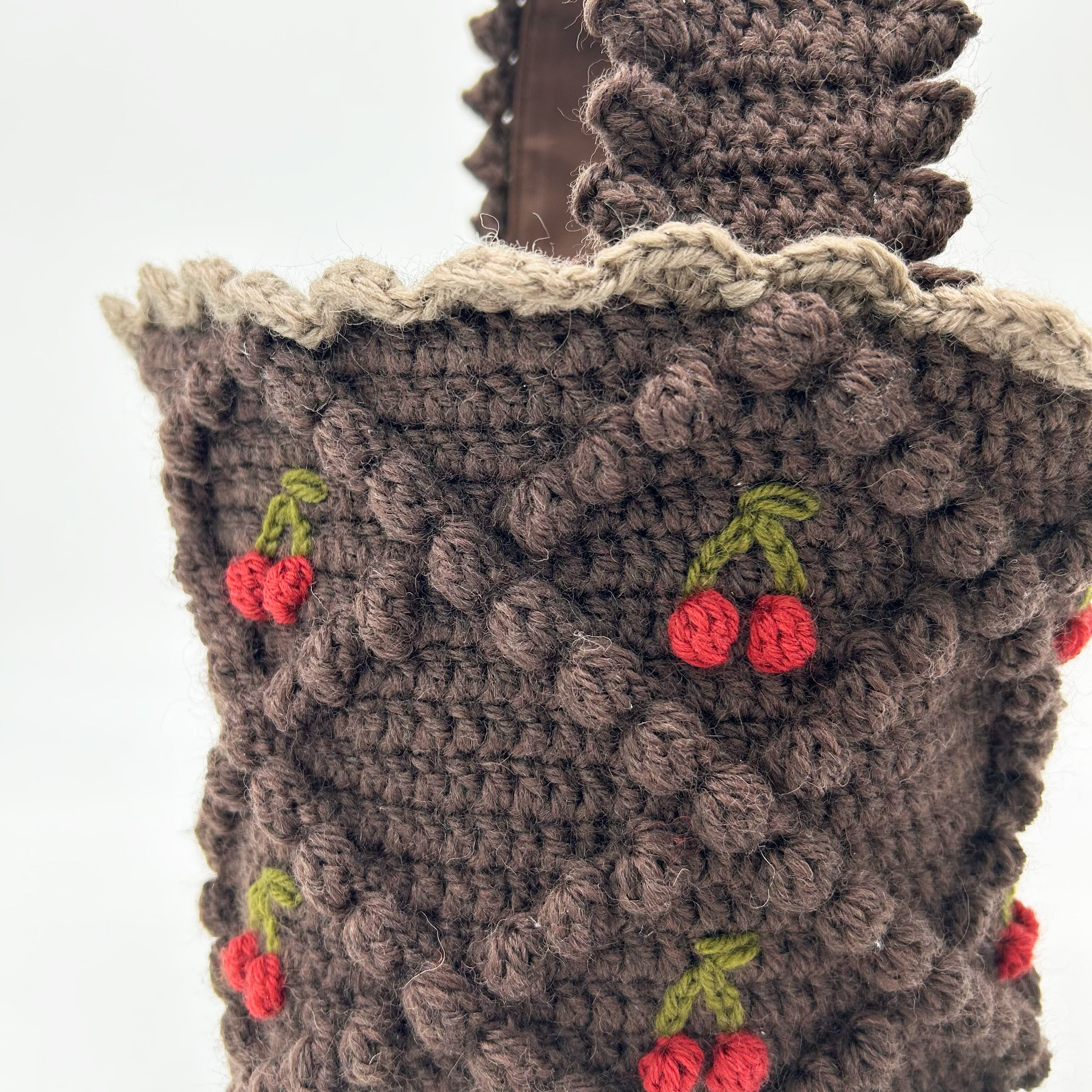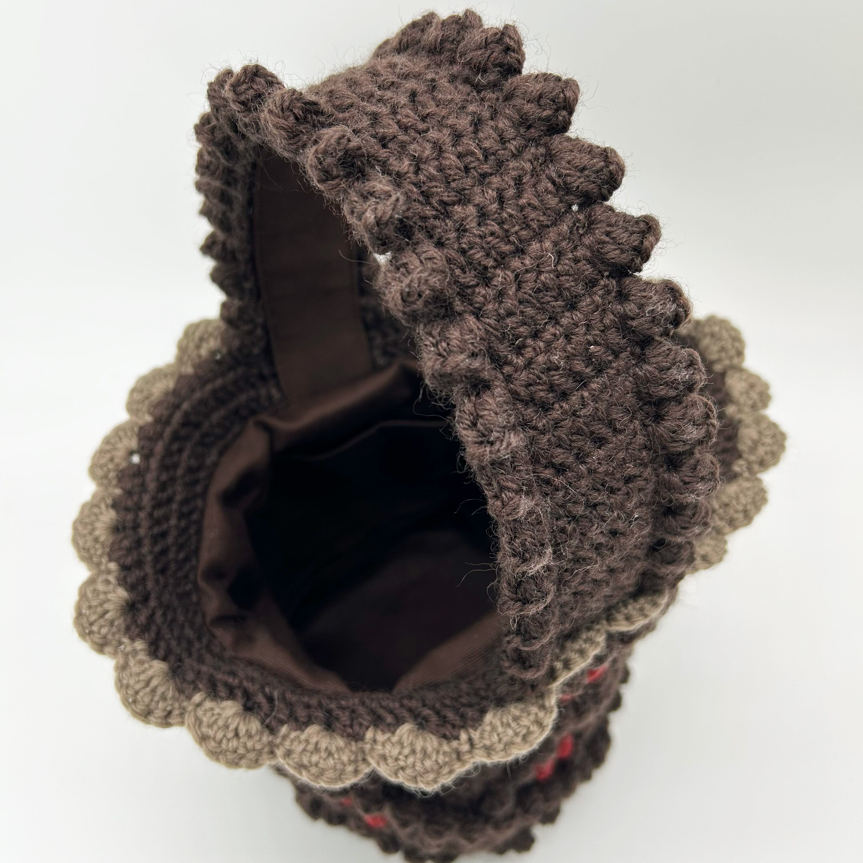 ヴィンテージのチロルカーディガンをイメージして作りました。本体と持ち手は裏布を縫い付け、底板も入っているので物を入れても形が崩れにくい構造です。 内側にはポケットがついています