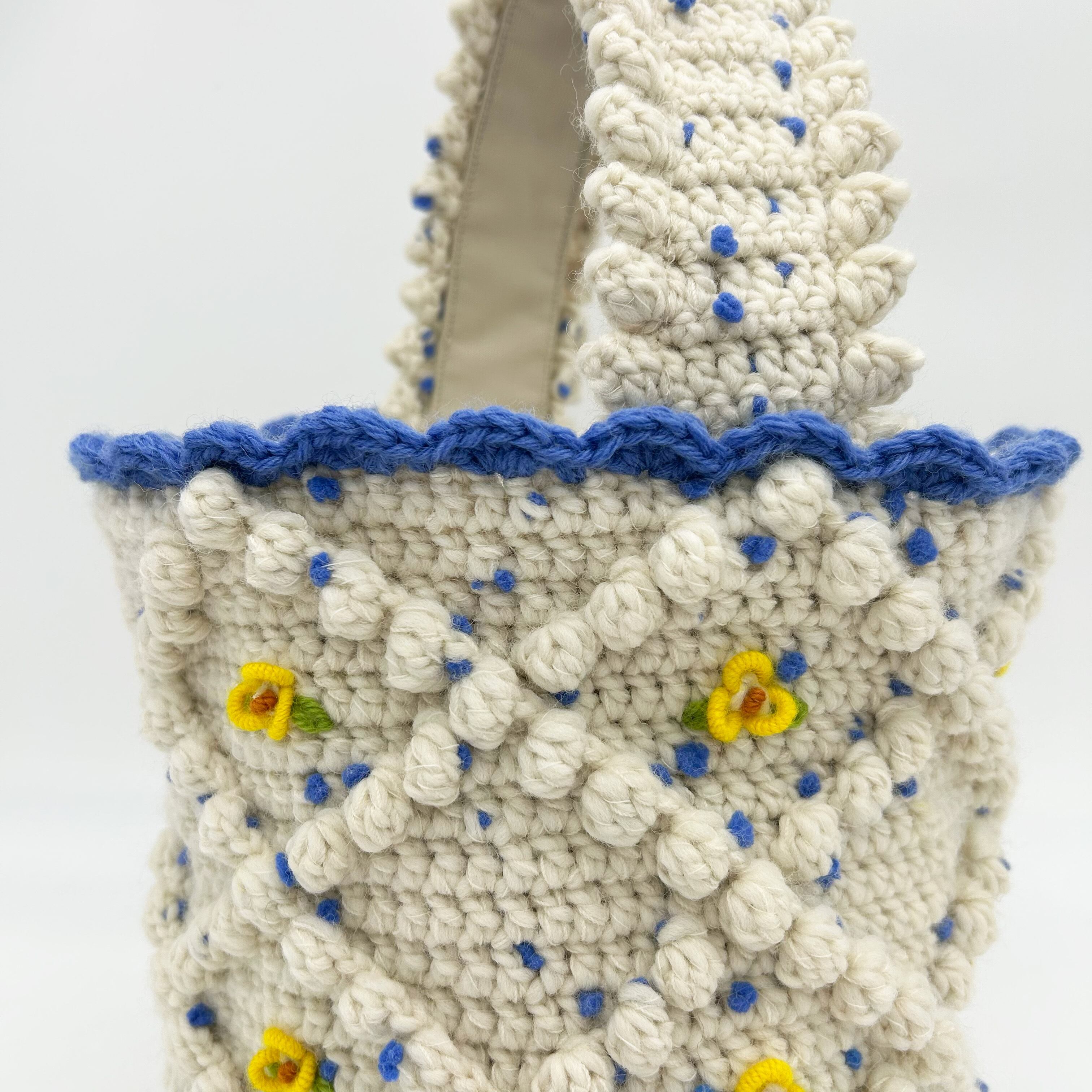 ヴィンテージのチロルカーディガンをイメージして作りました。本体と持ち手は裏布を縫い付け、底板も入っているので物を入れても形が崩れにくい構造です。 内側にはポケットがついています