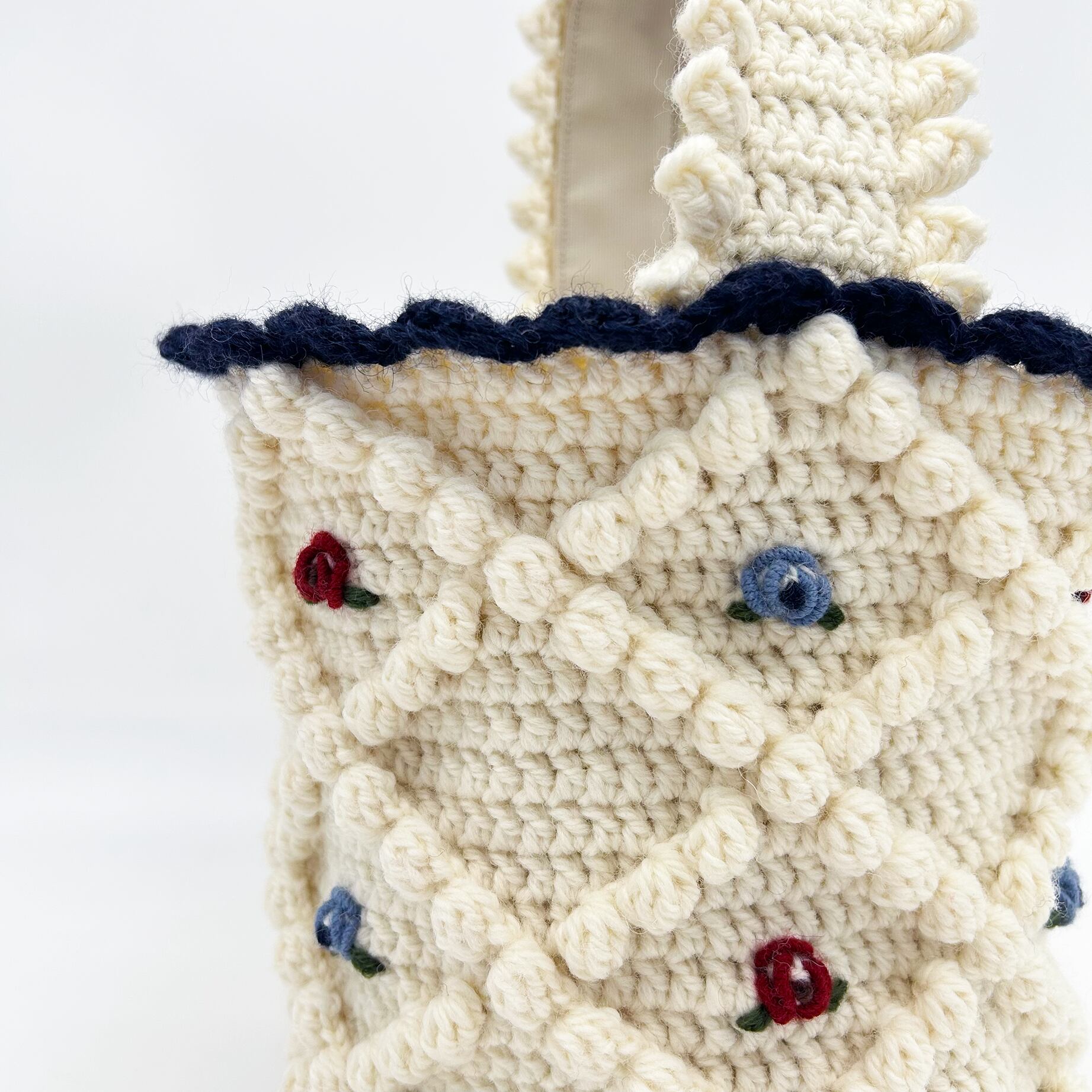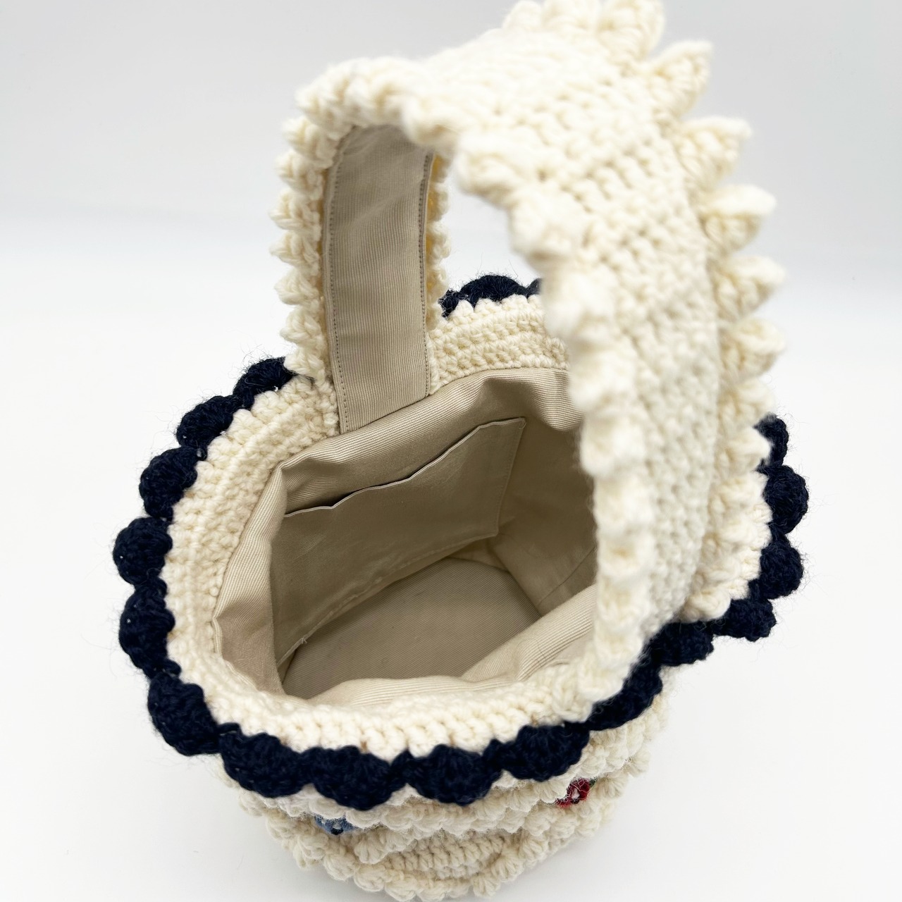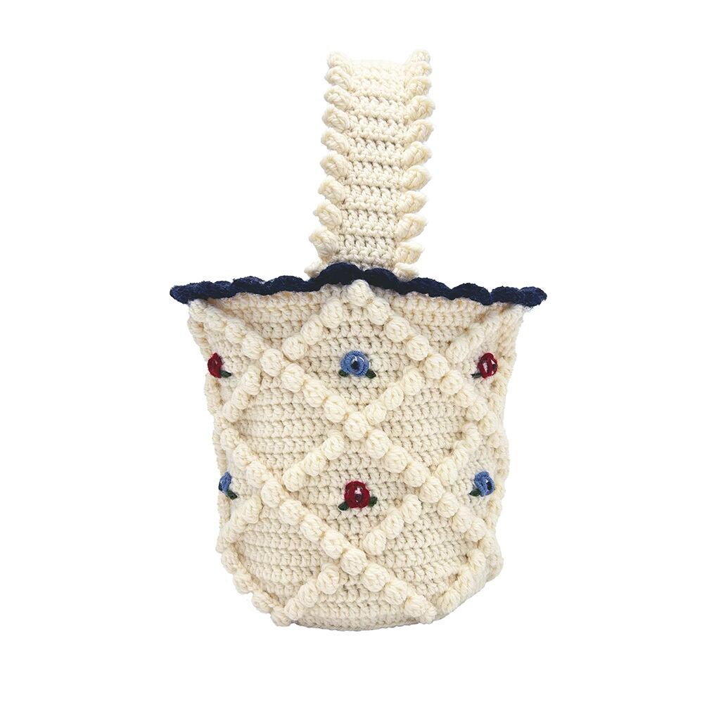 ヴィンテージのチロルカーディガンをイメージして作りました。本体と持ち手は裏布を縫い付け、底板も入っているので物を入れても形が崩れにくい構造です。 内側にはポケットがついています