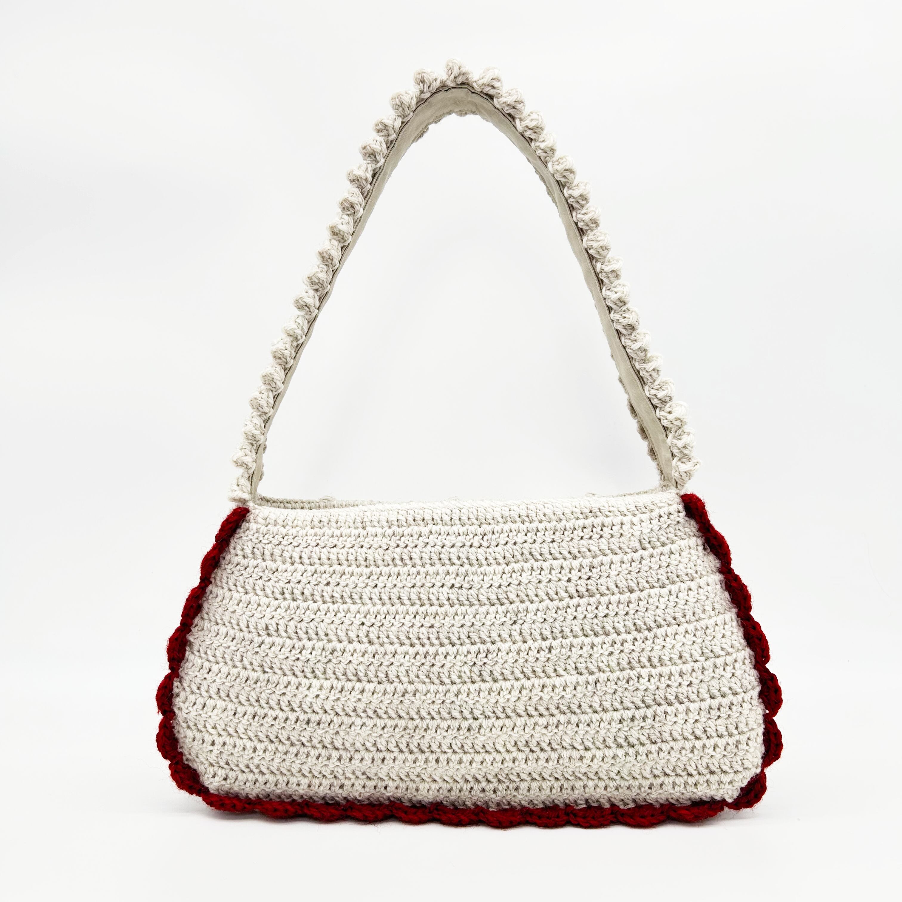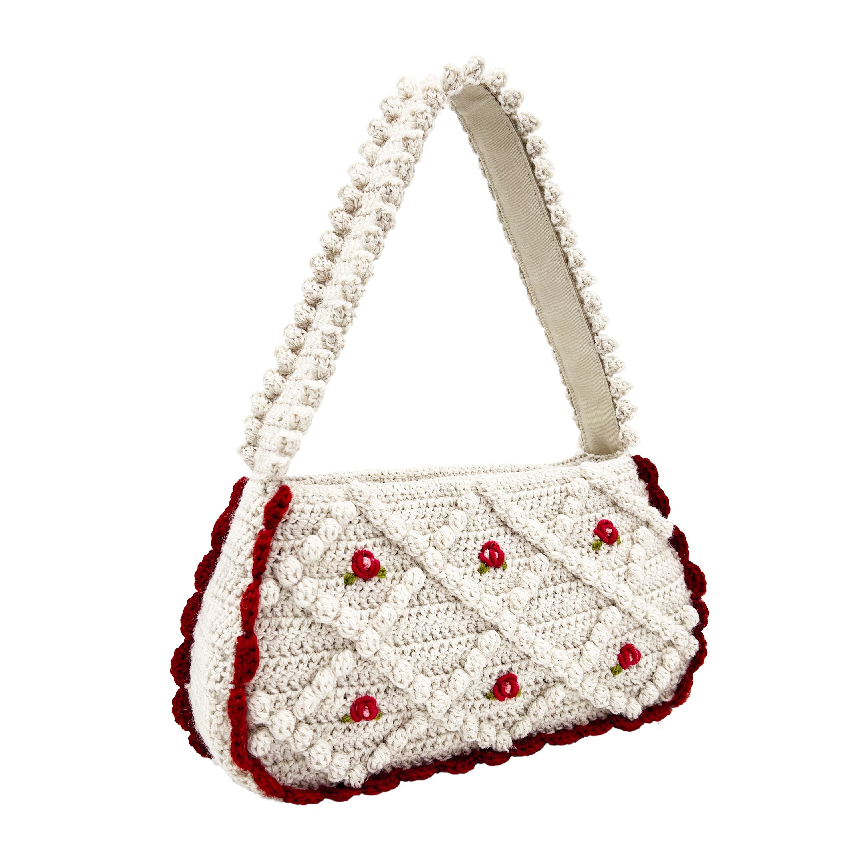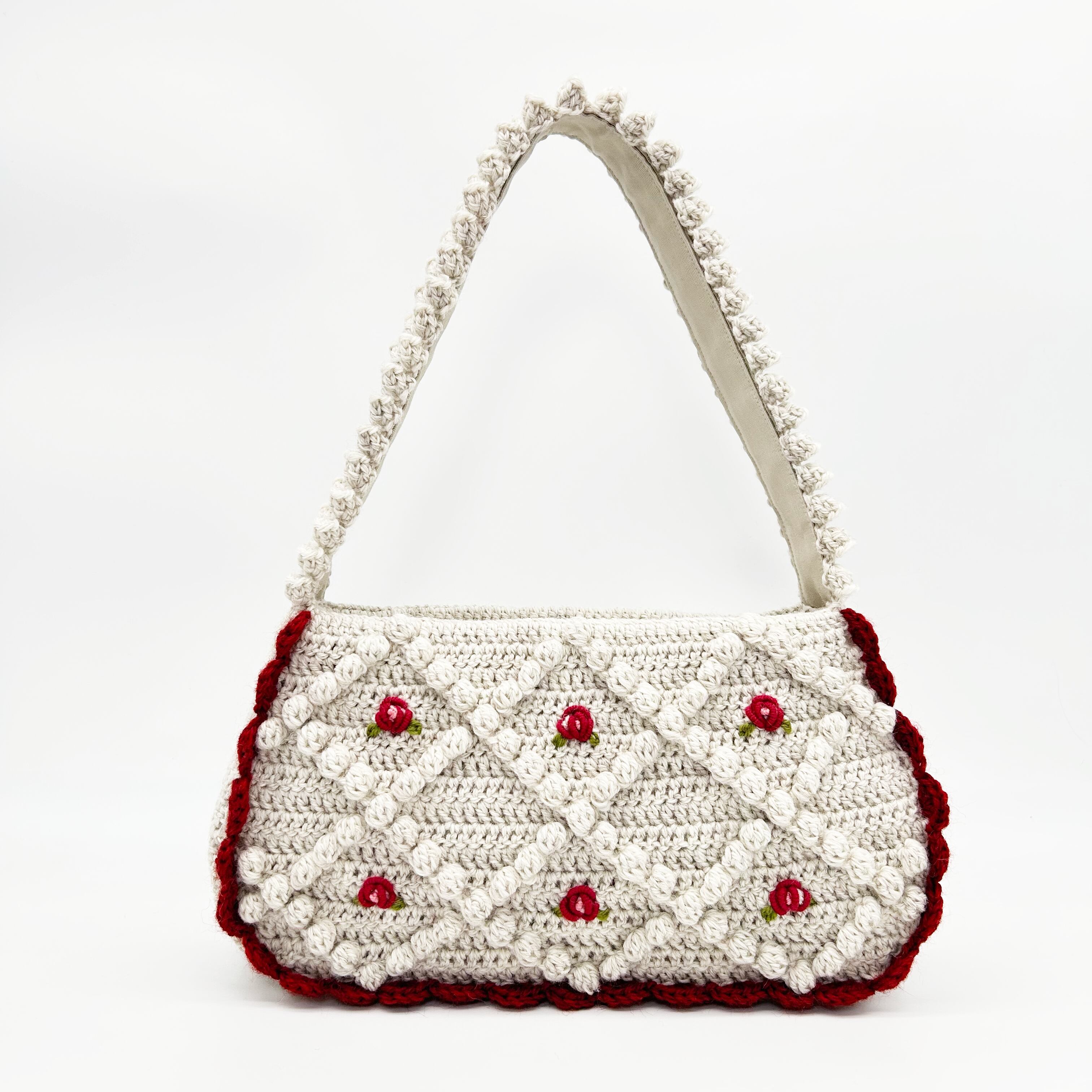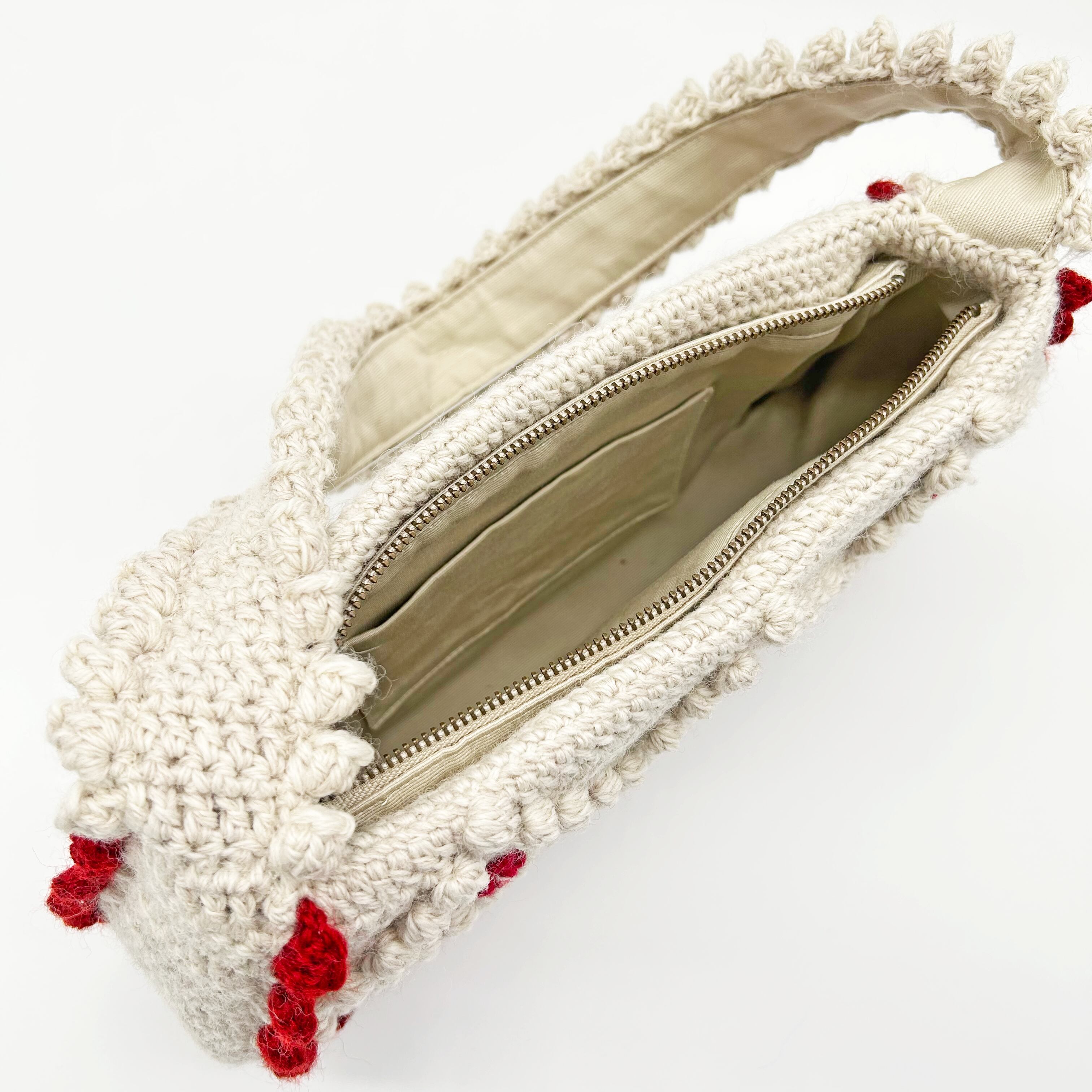 ヴィンテージのチロルカーディガンをイメージして作りました。本体と持ち手は裏布を縫い付け、底板も入っているので物を入れても形が崩れにくい構造です。 内側にはポケットがついています