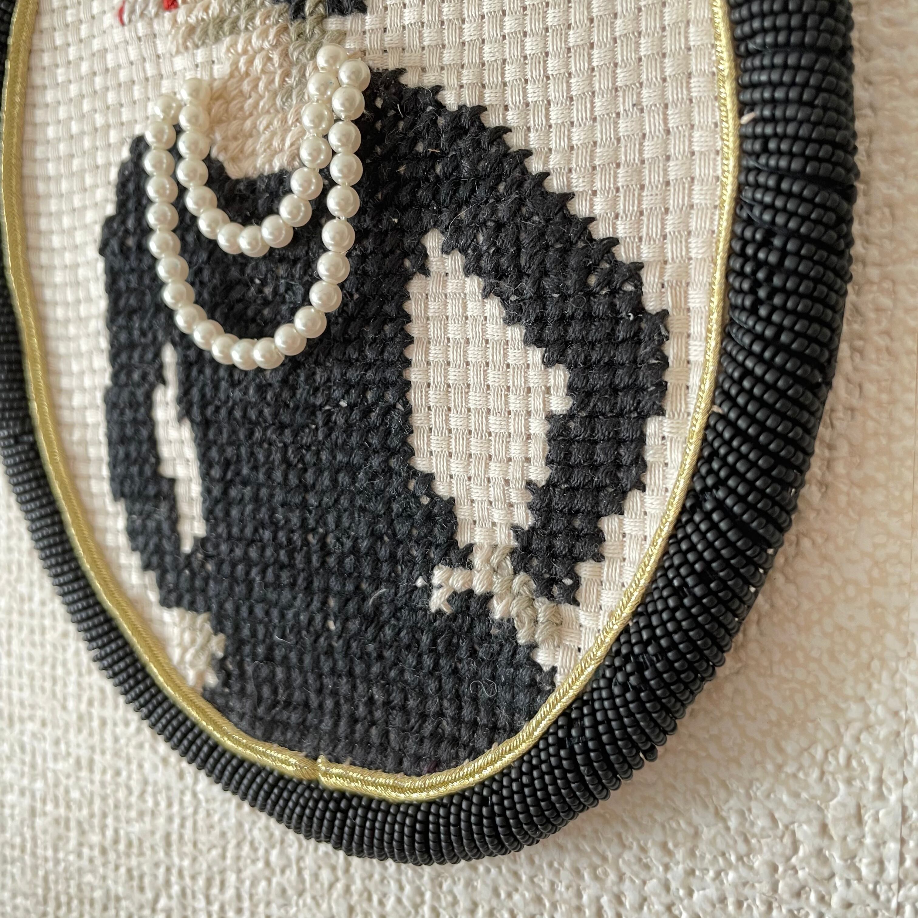 フレーム部分も刺繍になっており、芯を入れて一列ずつビーズを刺しています