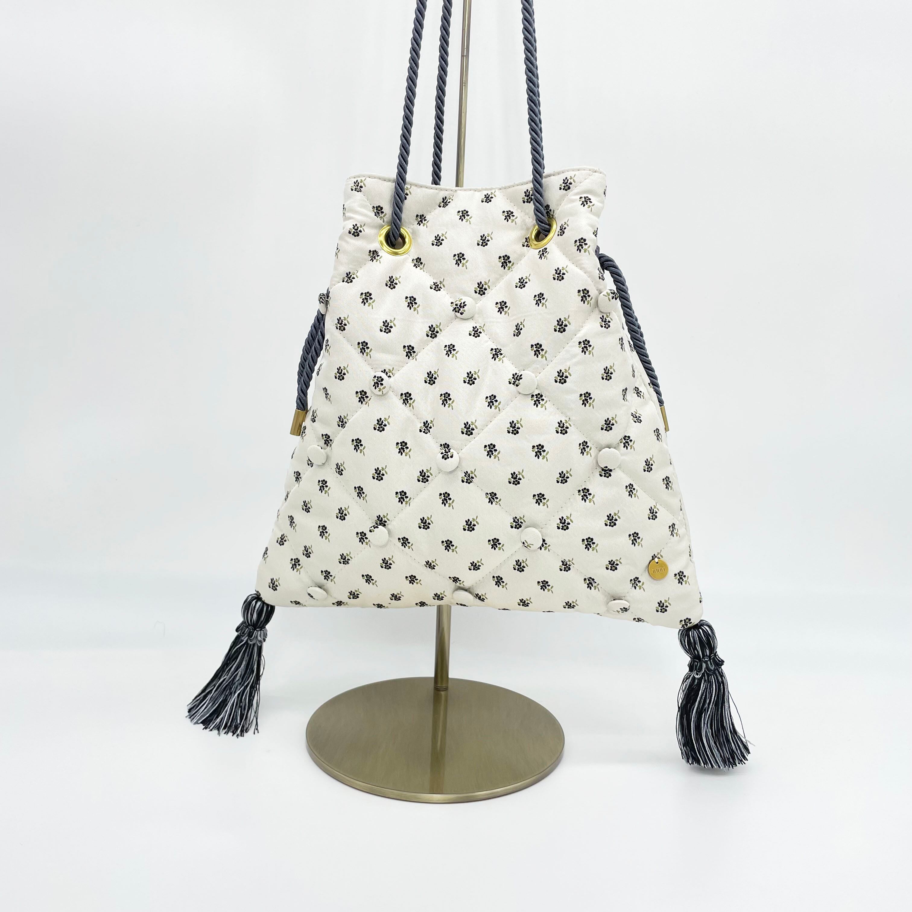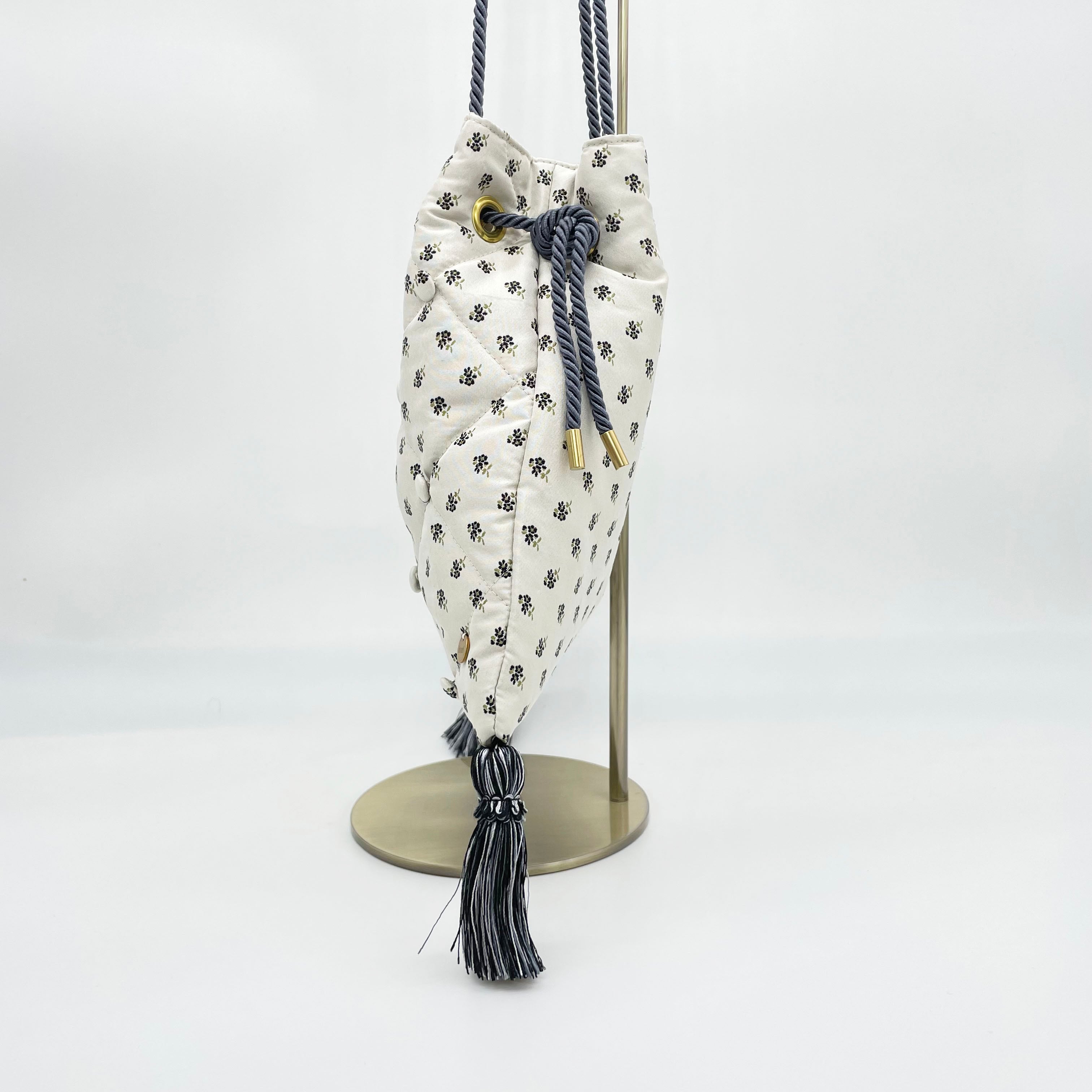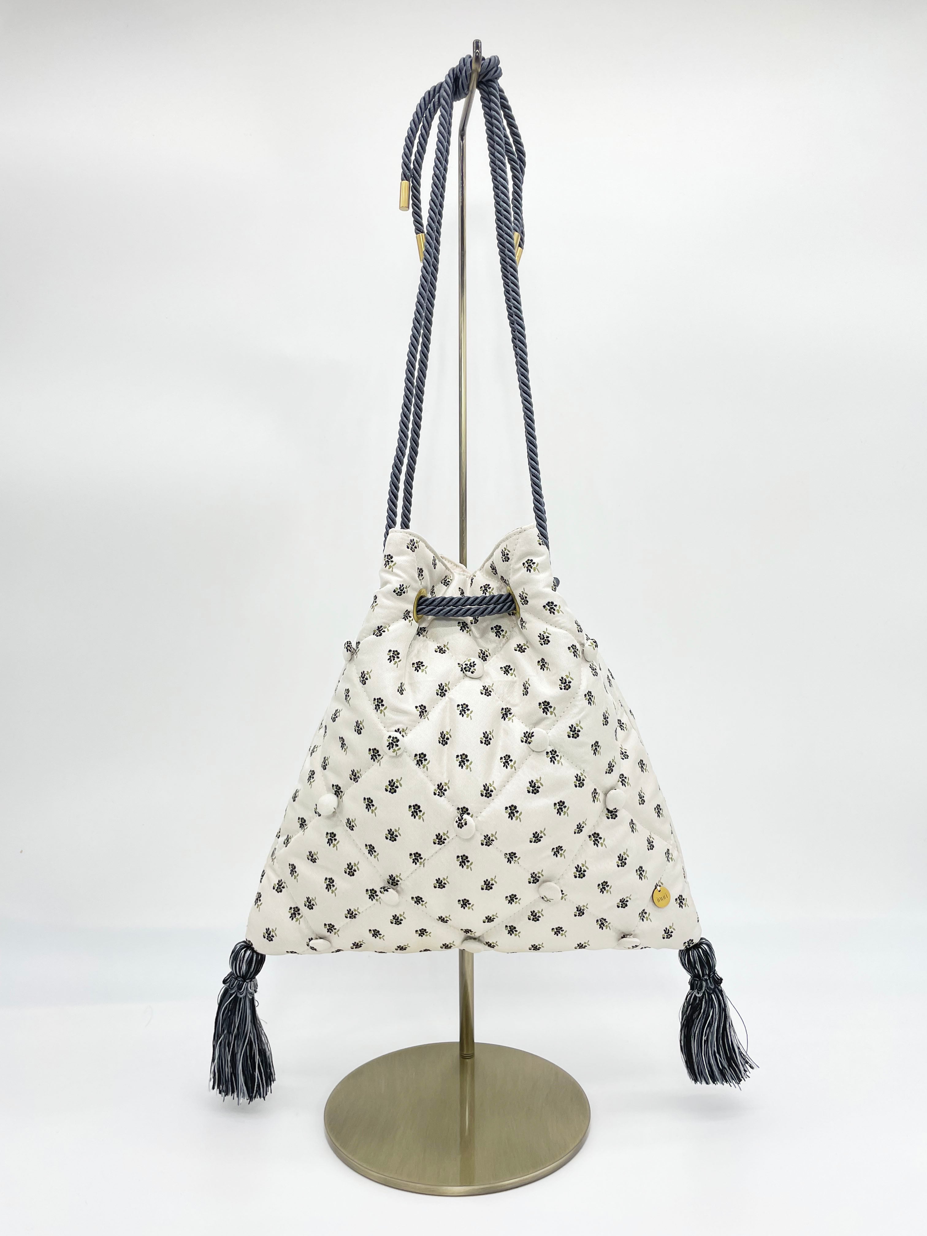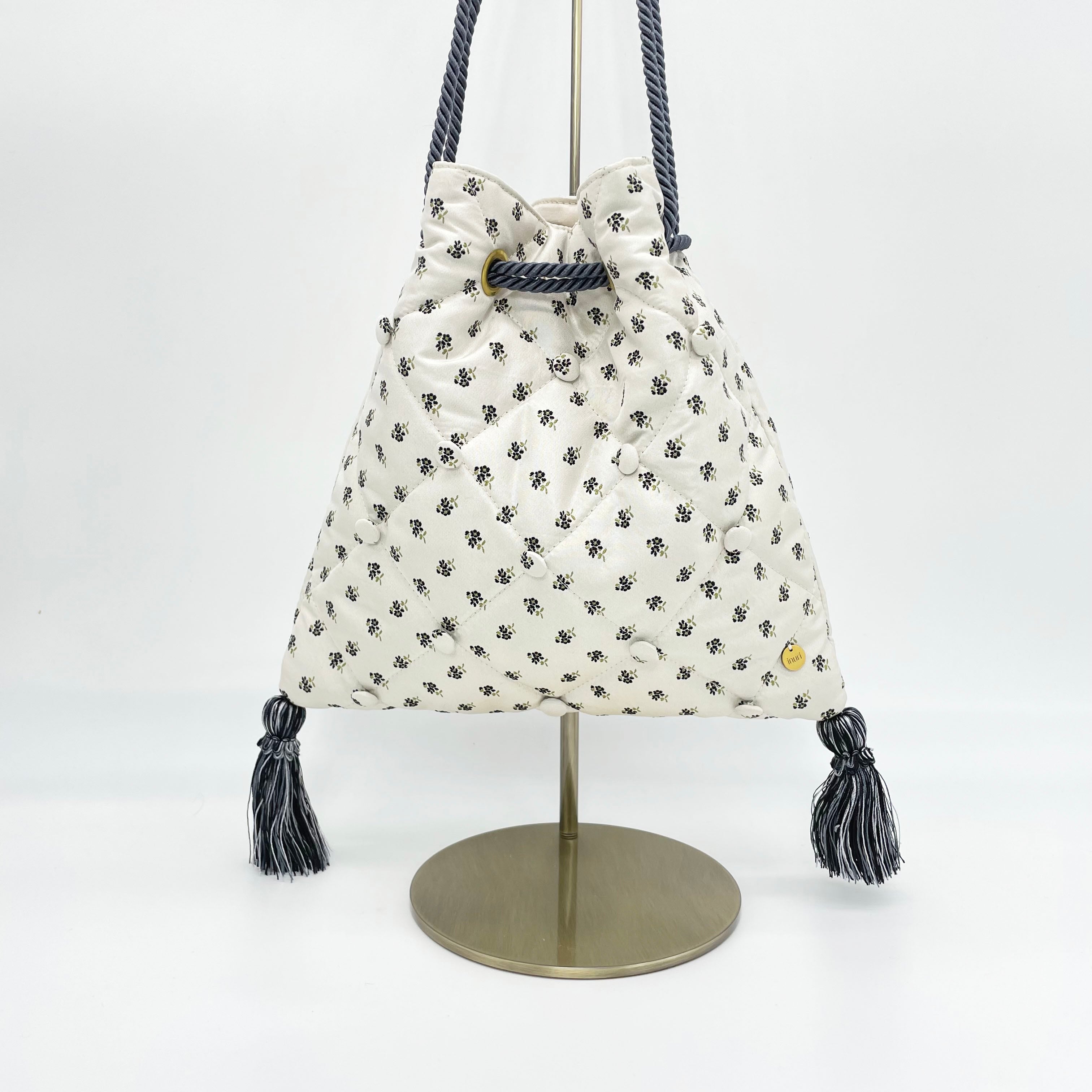 バッグの形はロココ調の寝室にあるようなソファをイメージしていて、表面のキルティング、ボタン、タッセルがポイントです