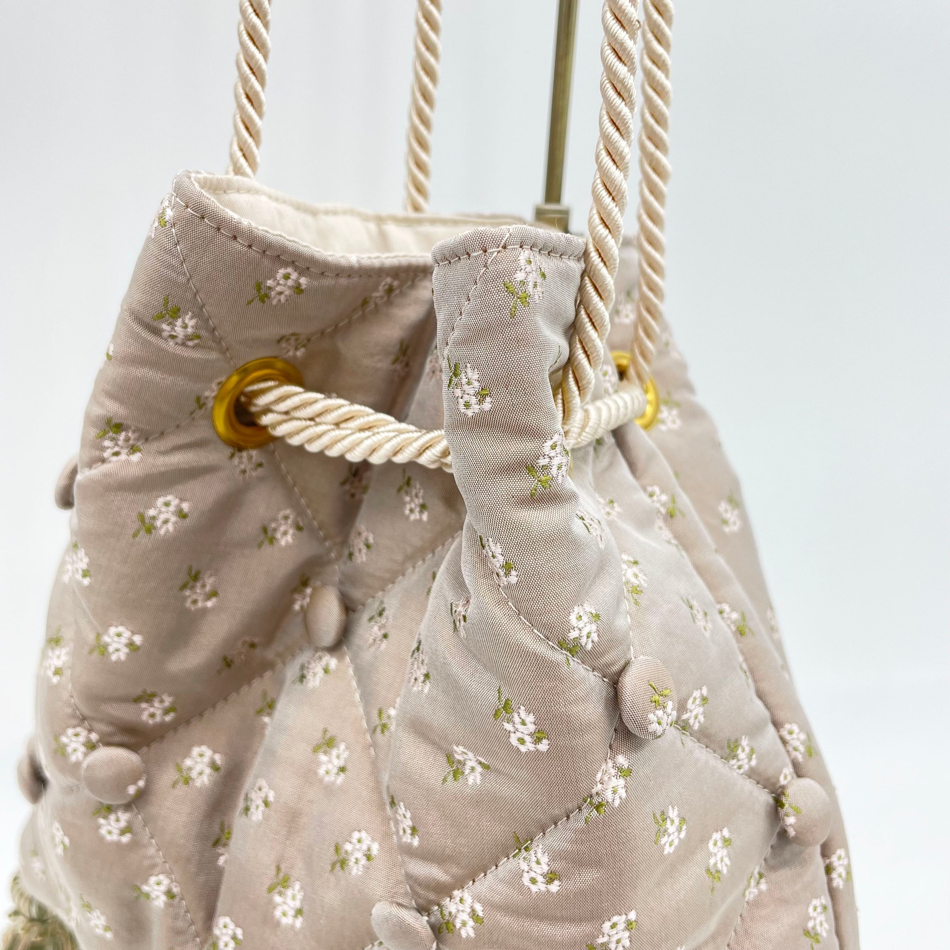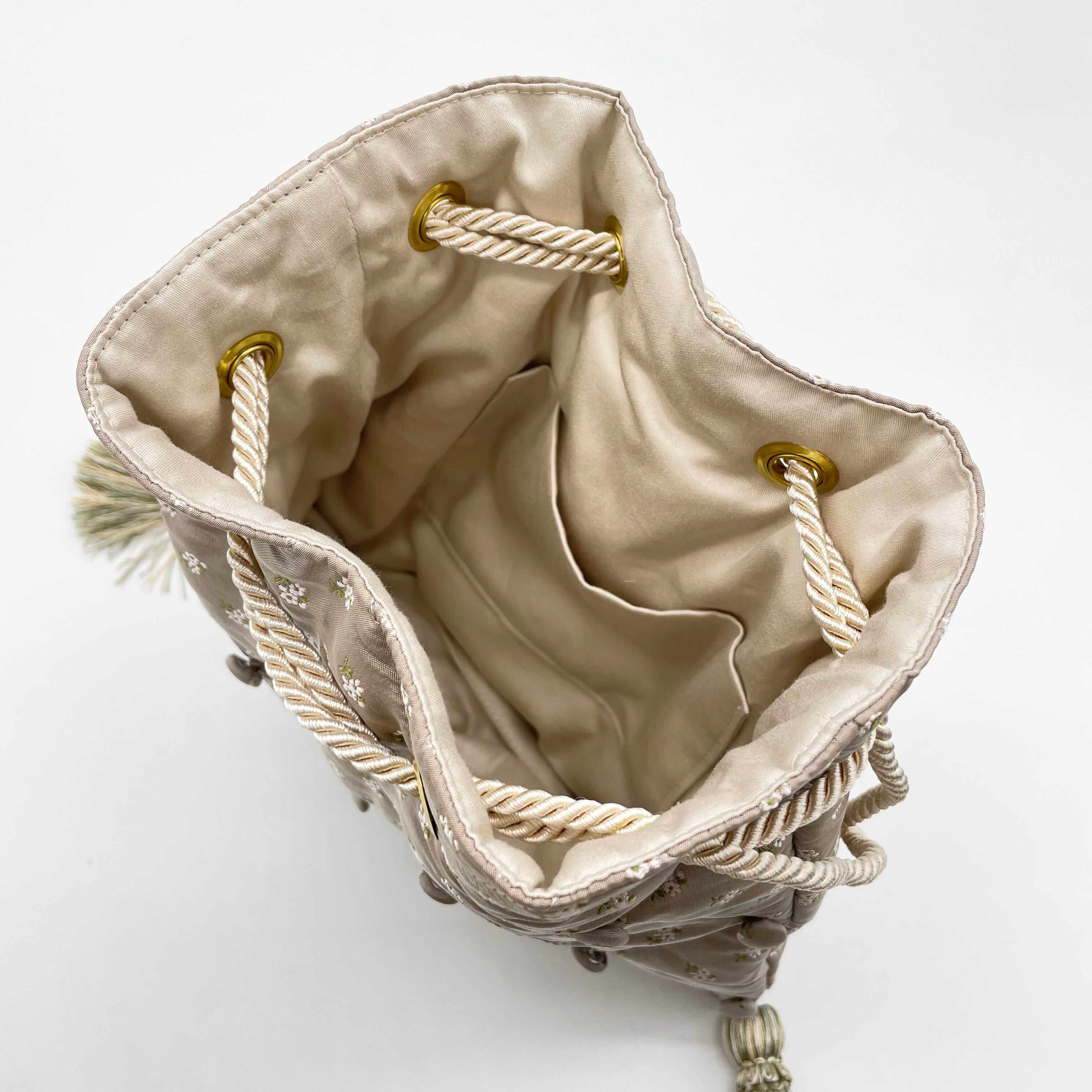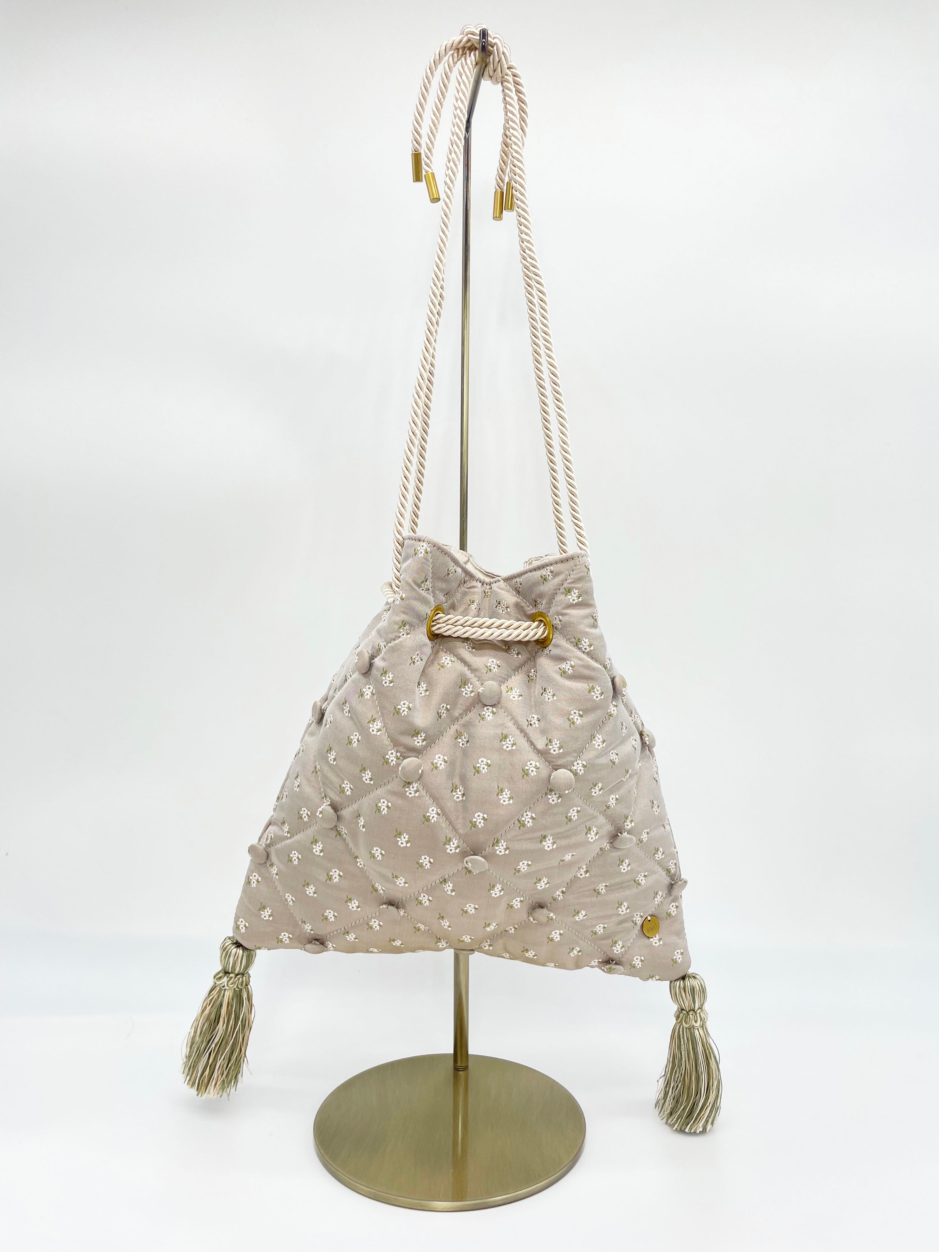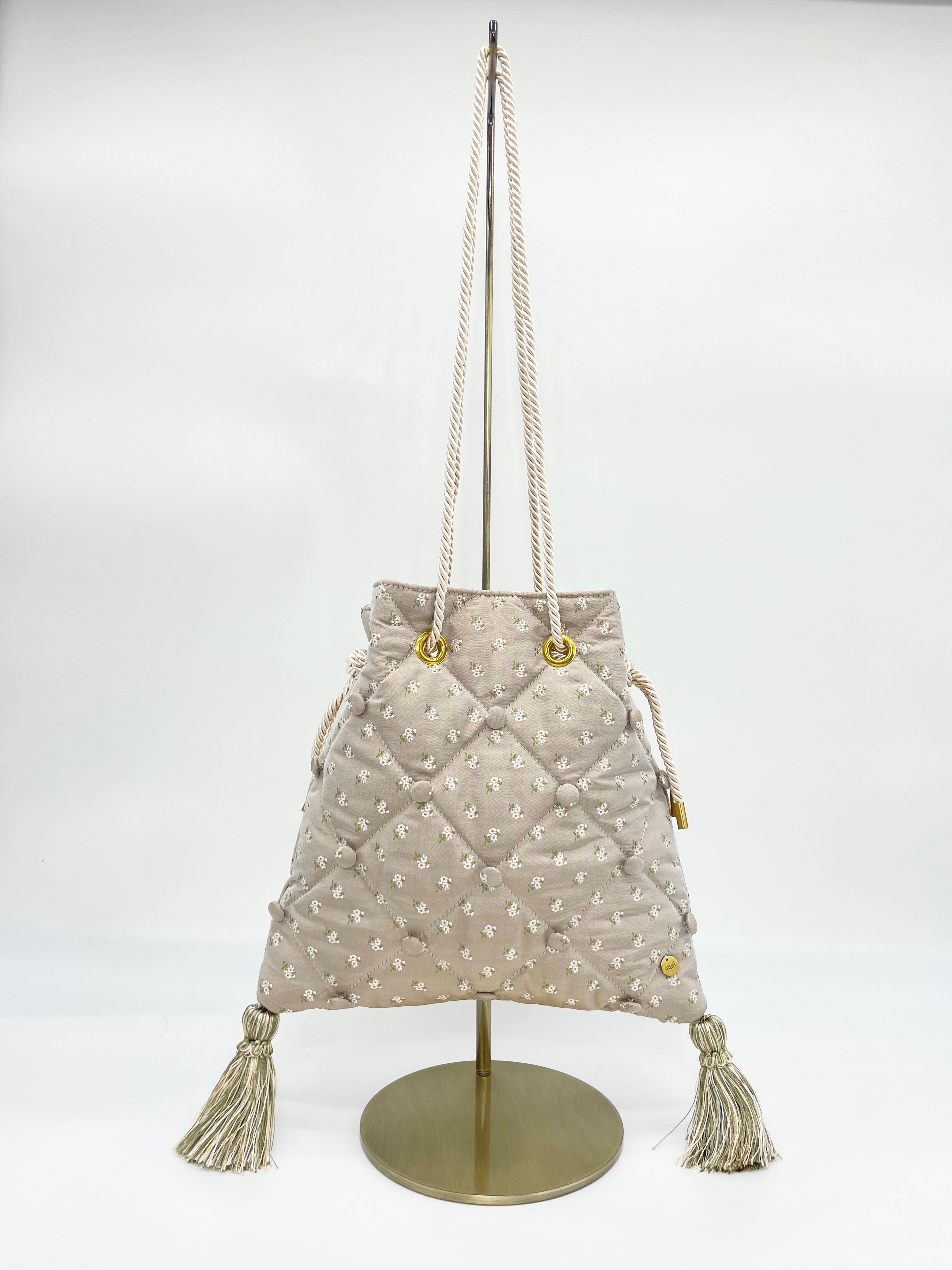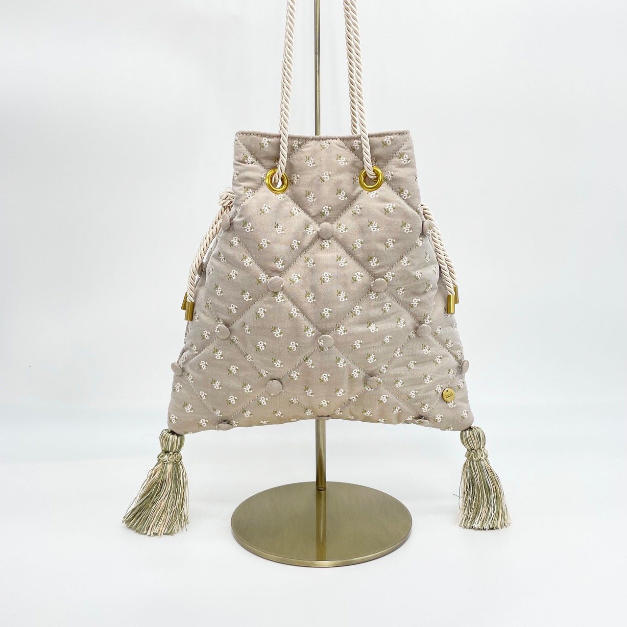 バッグの形はロココ調の寝室にあるようなソファをイメージしていて、表面のキルティング、ボタン、タッセルがポイントです
