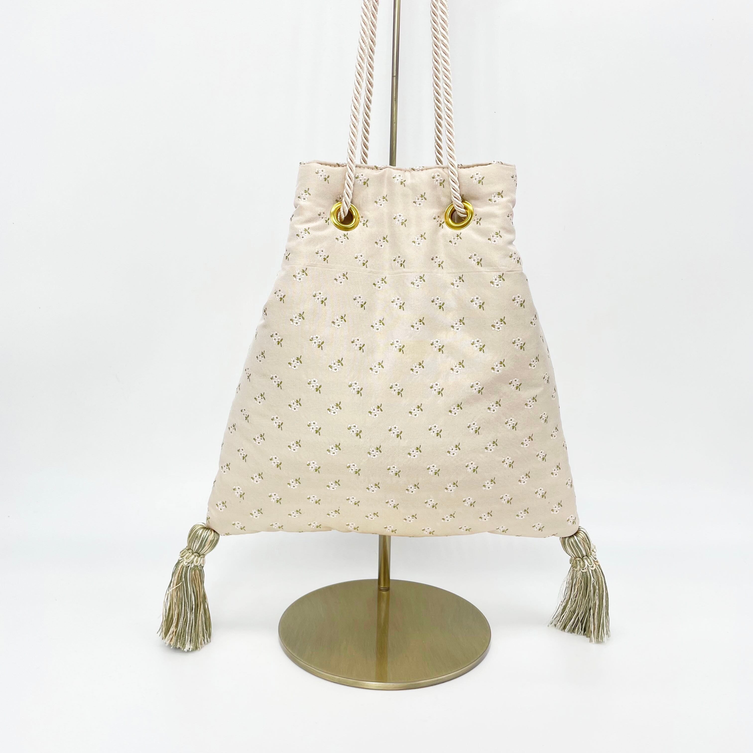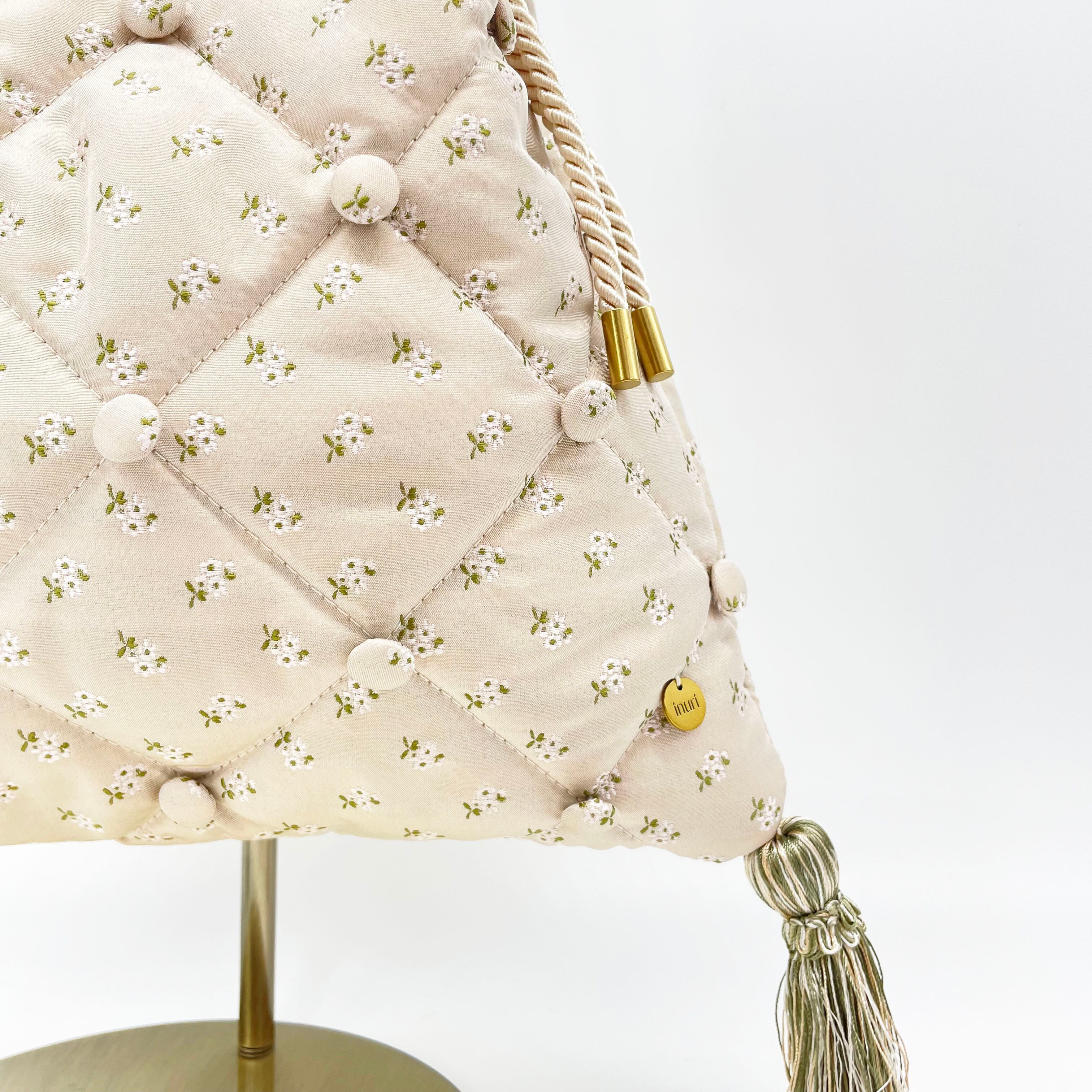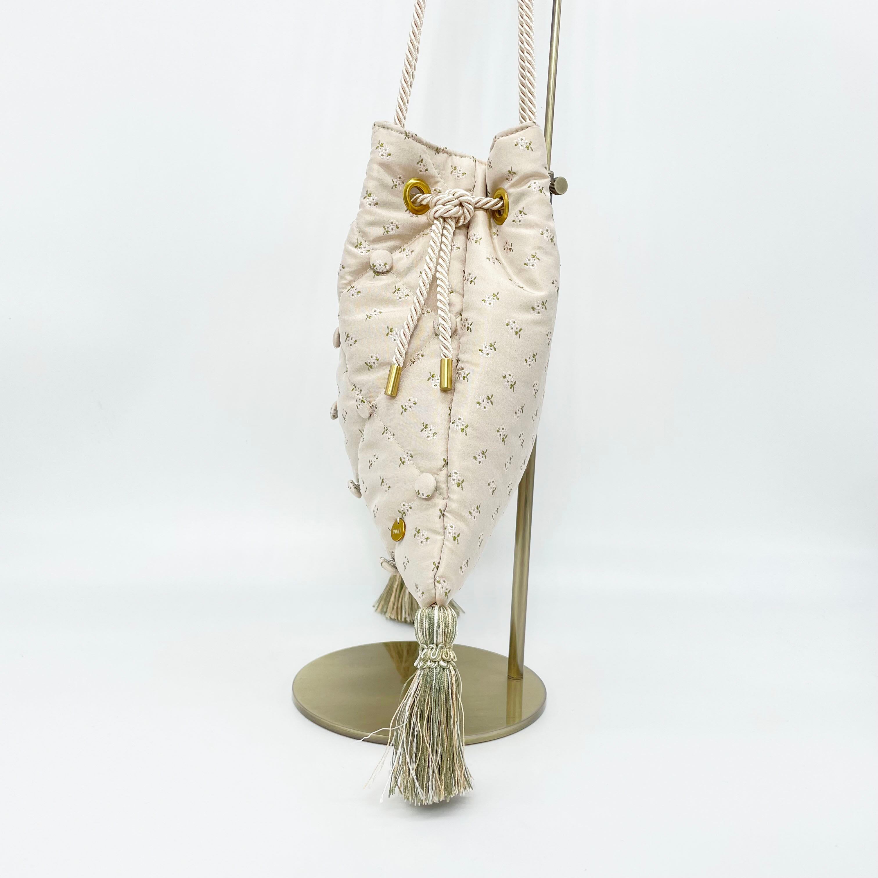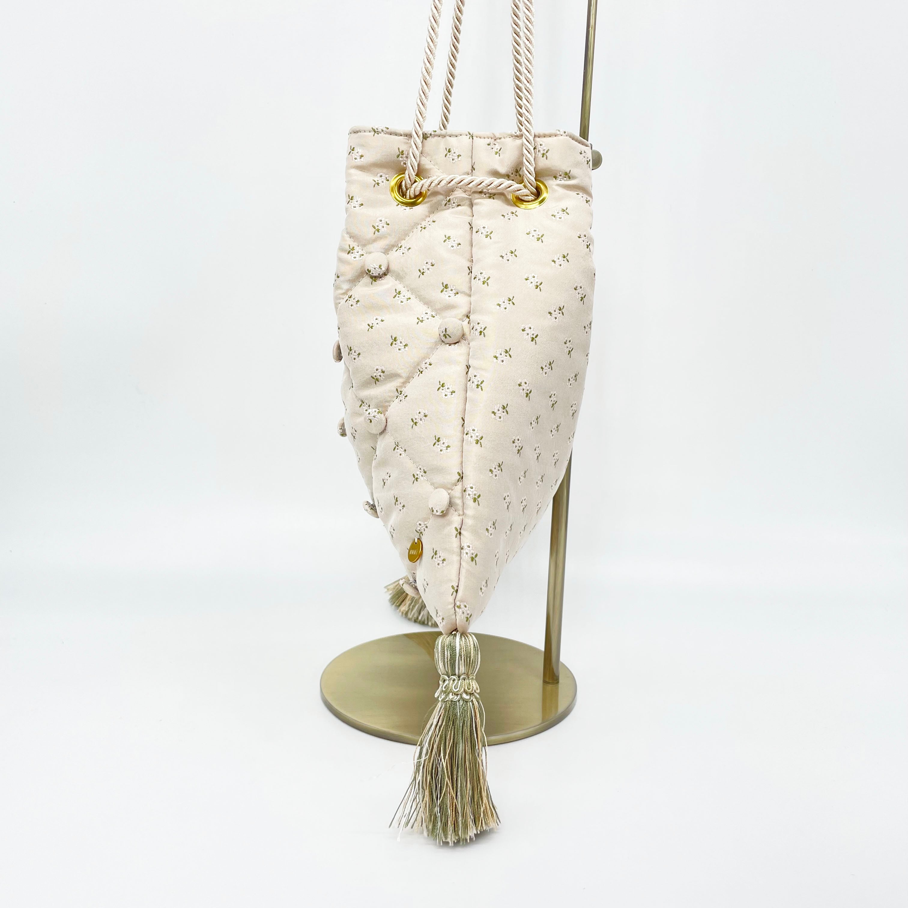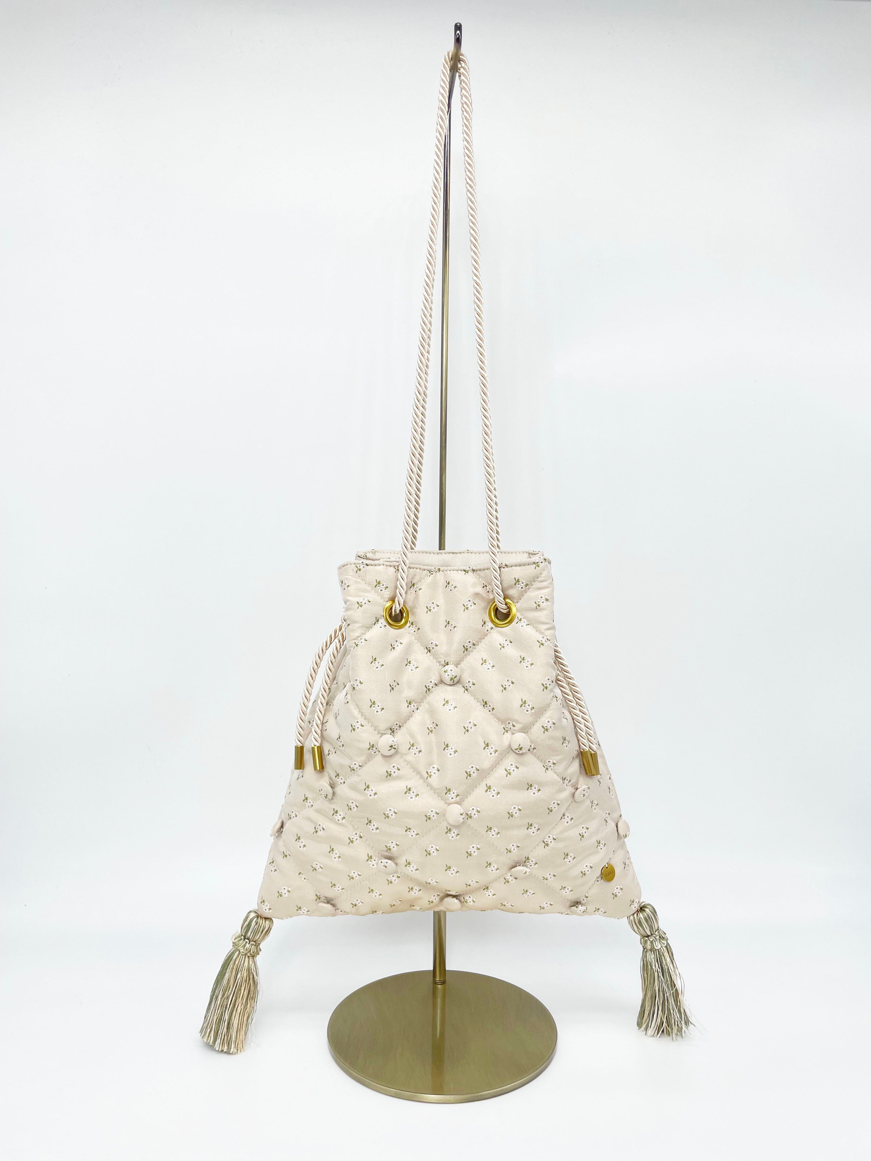 バッグの形はロココ調の寝室にあるようなソファをイメージしていて、表面のキルティング、ボタン、タッセルがポイントです