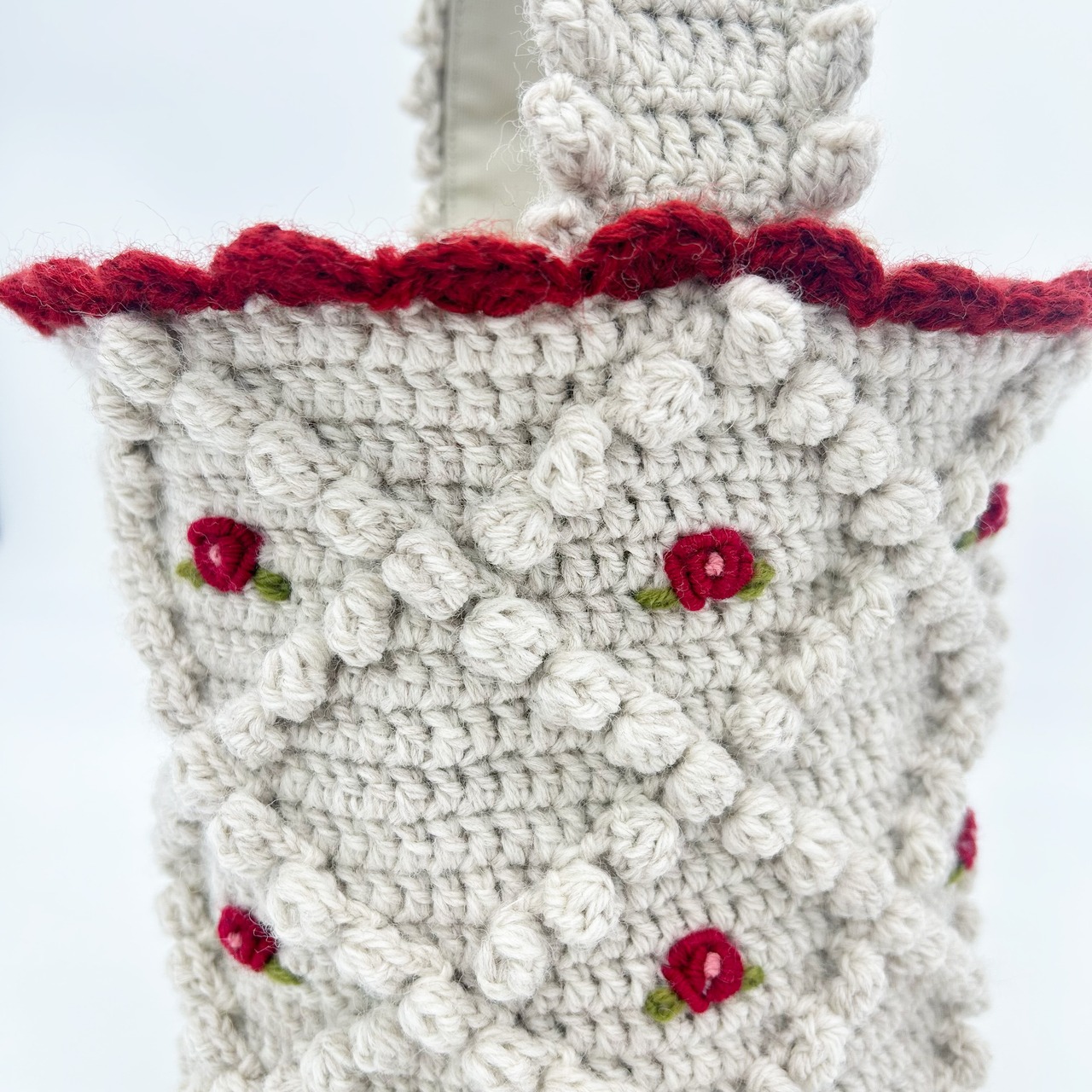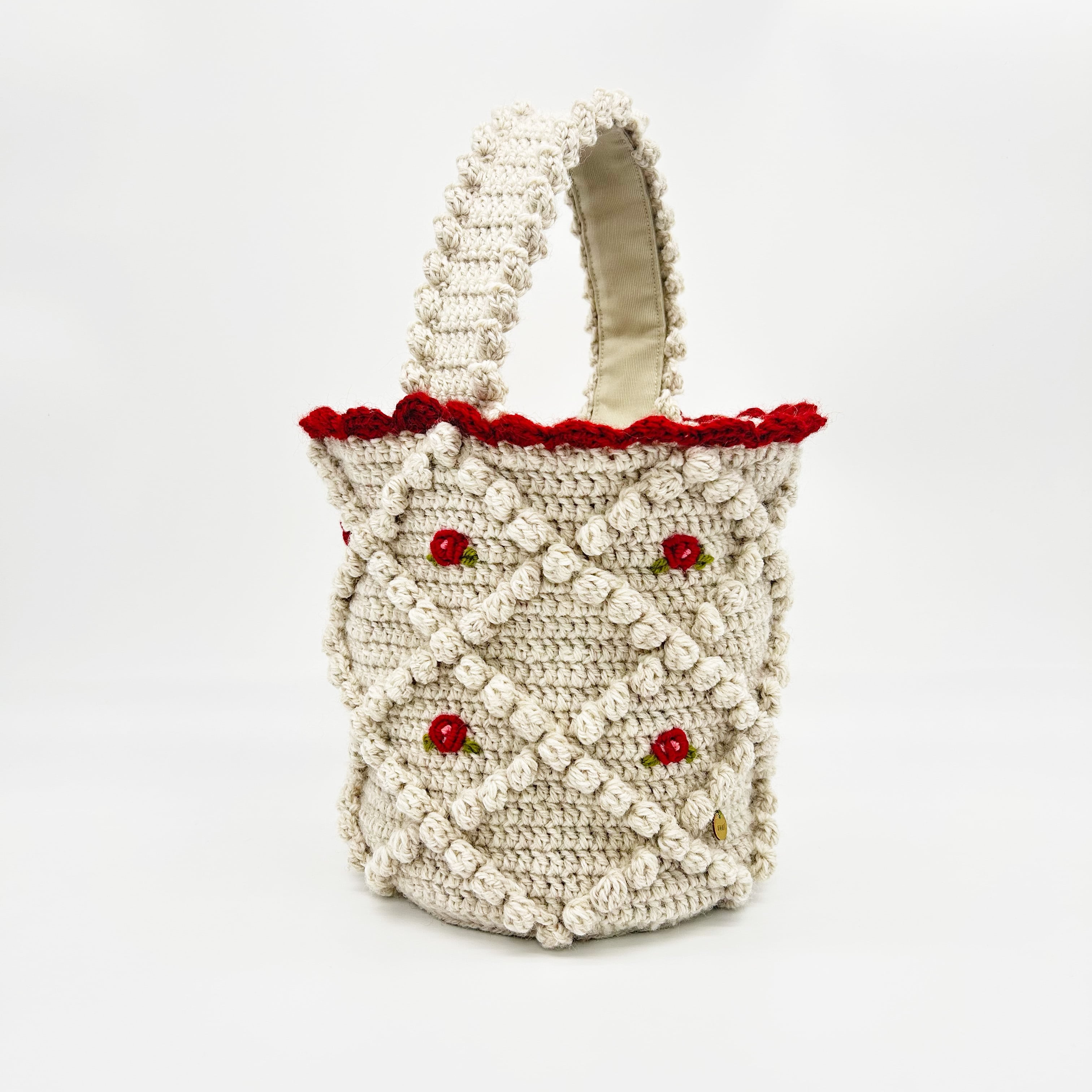 ヴィンテージのチロルカーディガンをイメージして作りました。本体と持ち手は裏布を縫い付け、底板も入っているので物を入れても形が崩れにくい構造です。 内側にはポケットがついています