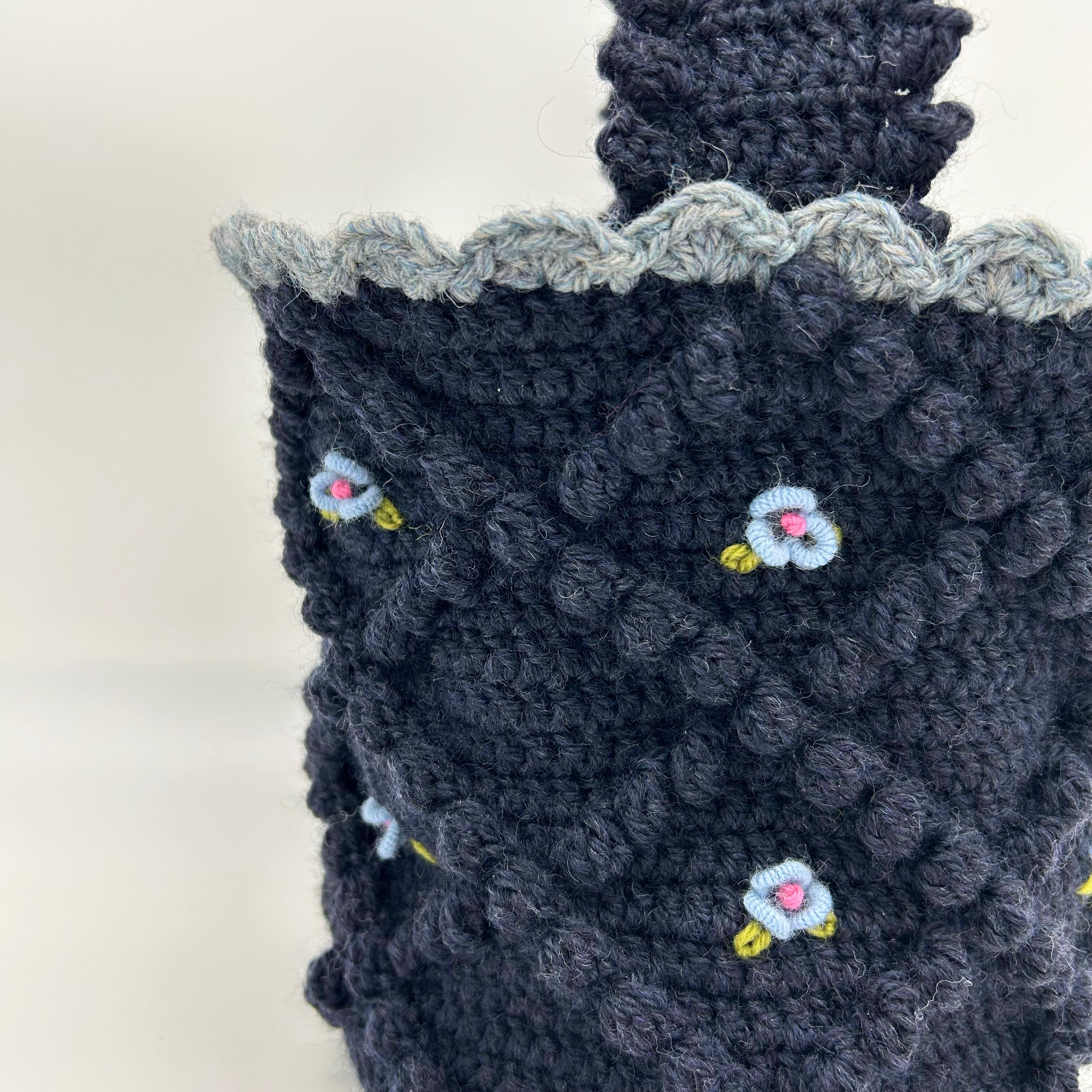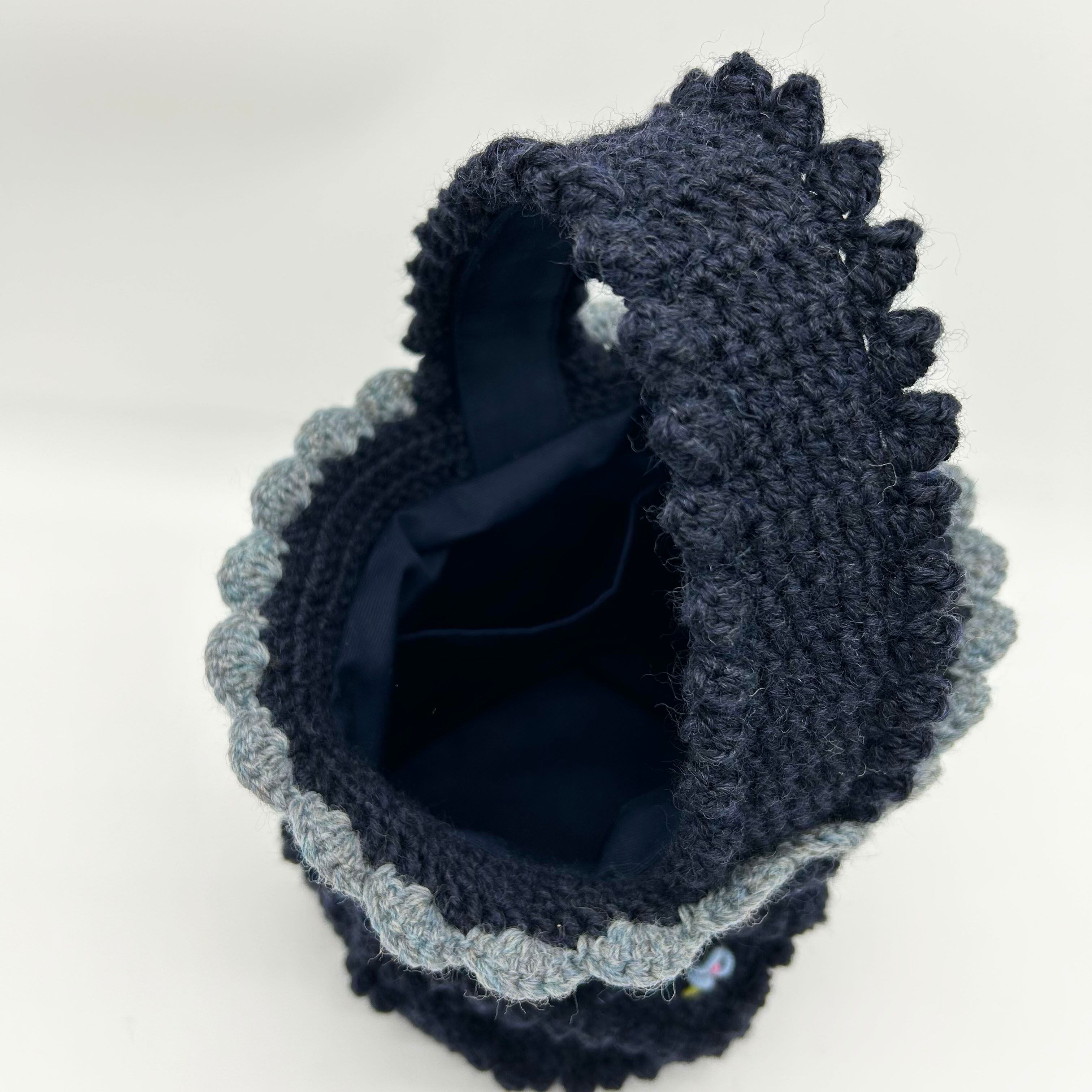 ヴィンテージのチロルカーディガンをイメージして作りました。本体と持ち手は裏布を縫い付け、底板も入っているので物を入れても形が崩れにくい構造です。 内側にはポケットがついています